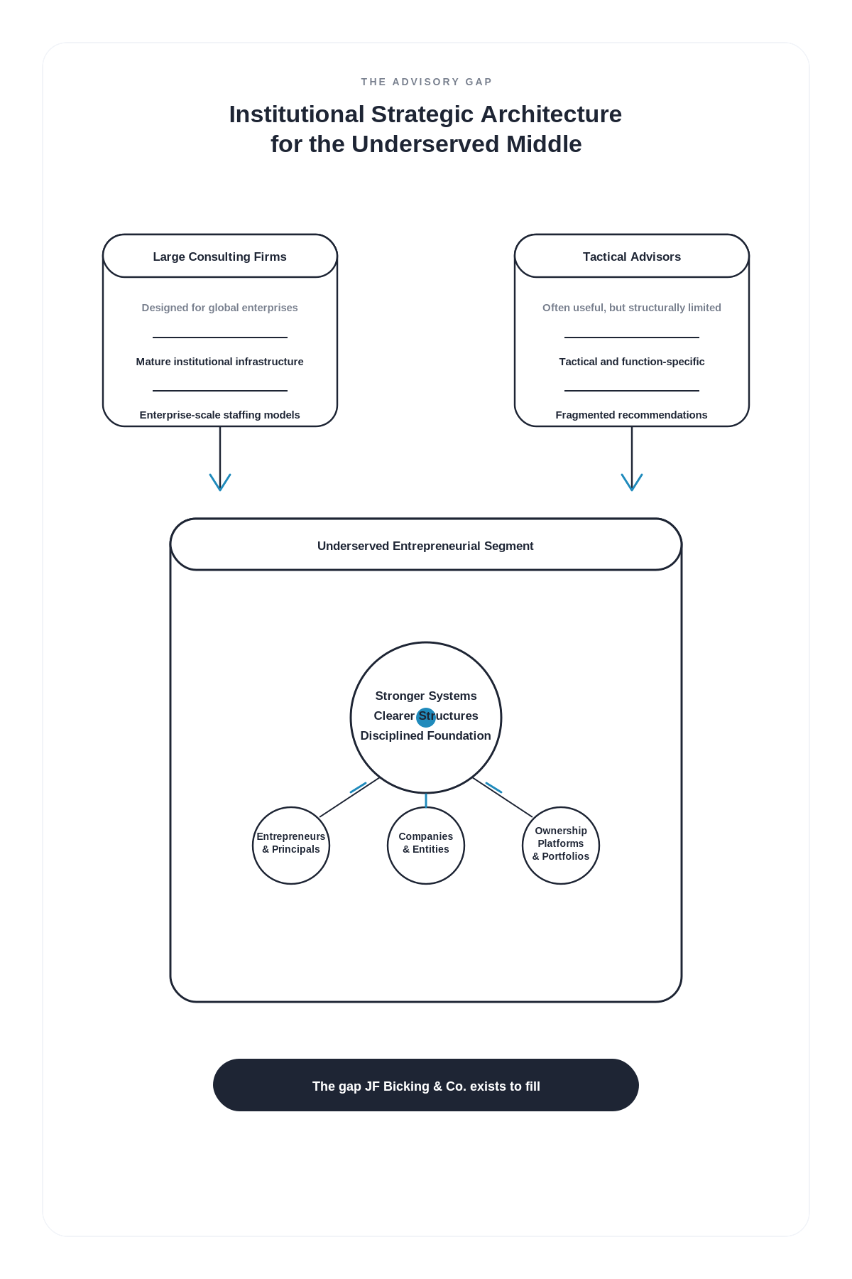 Large consulting firms are designed to serve global enterprises with mature institutional infrastructure. Traditional small-business advisors often lack the strategic rigor required to design enterprise-level operating systems. Between those two extremes lies a large and underserved segment of the economy: entrepreneurs, companies, and ownership platforms navigating growth, complexity, transition, ownership evolution, and strategic inflection points. These clients do not simply need more activity. They do not need disconnected recommendations. They need stronger systems, clearer structures, and a more disciplined operating foundation. That is the gap JF Bicking & Co. exists to fill.